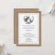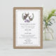 A wedding invitation featuring an illustration of purple flowers and greenery arranged around the busts of a buck and doe . Personalise with your initial inside circle. Personalise the text with details of your occasion. Wording is from bride's parents. Background is burlap inspired with lace design on front.