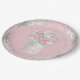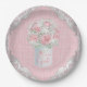Burlap and mason jar baby shower paper plates with beautiful pink rose and baby's breath mason jar on a pretty pink and silver white burlap swirl background. These sweet rustic burlap mason jar baby shower paper plates are easily customised for your event by simply adding the text of your choice, or you can delete the text.