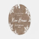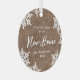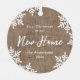 Personalised first Christmas in our new home ornaments feature elegant trendy script and snowflakes on rustic burlap background, optional couple photo on the back, modern and simple.