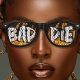 Cool black retro sunglasses with burning flames of fire and bold white graffiti text "Baddie". Great for cute women and girls.
