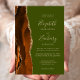 The left-hand edge of this elegant modern wedding invitation features a burnt orange watercolor agate border trimmed with faux gold glitter. The customisable text combines tan handwriting, copperplate and italic fonts on an olive green background. The reverse side features a matching burnt orange and gold agate design.