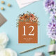 This exquisite acrylic table number features a stunning burnt orange, rust, copper floral design in an arch shape.  Easily personalise each table number by clicking the "Edit Using Design Tool" button to re-arrange and format the text to your liking. Choose from two exquisite finishes: Clear or Frosted, and select between two stylish corner options: Rectangle or Arched.