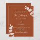 Dark burnt orange background, decorated with eucalyptus stems, sprigs. Personalise and add your names and the details.