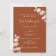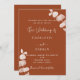 Dark burnt orange background, decorated with eucalyptus stems, sprigs. Personalise and and add your names and the details.