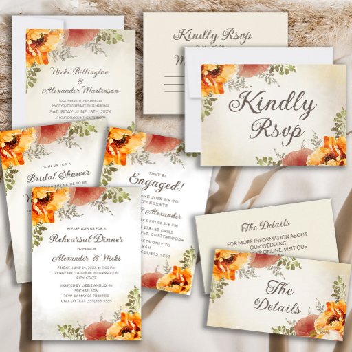 Modern and elegant burnt orange and coral watercolor floral and greenery fall/autumn botanical country-style wedding invitation. The bride's and groom's names are written in a beautiful handwritten, calligraphy script font.
