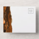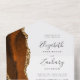 The left-hand edge of this elegant modern all-in-one wedding invitation and RSVP features a burnt orange watercolor agate border trimmed with faux gold glitter. The customisable text combines charcoal grey handwriting, copperplate and italic fonts on a white background. The return address appears on the outside flap and the reverse side of the detachable RSVP card.