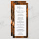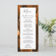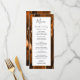 This elegant, modern wedding menu features a watercolor burnt orange agate background trimmed with gold faux glitter. The text appears in charcoal grey handwriting and sans serif fonts on a white rectangle. The agate design is repeated on the reverse.