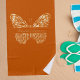 A burnt orange coloured background decorated with a large golden butterfly. Personalise and add your name.