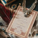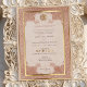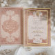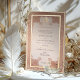 This exquisite wedding invitation captures the essence of traditional Muslim matrimony with its elegant lace design in a warm, burnt orange hue. The delicate intricacies of the border frame the page, leading the eye to the sacred Islamic calligraphy at the centre top. The aged parchment-like background provides a vintage feel, while the ornate details around the edges resonate with the grandeur of classic Muslim art. The rich colour palette of burnt orange, with accents of deep maroon and subtle cream, evokes the feeling of a sunset, perfect for an evening of celebration. This invitation is not only a herald of the upcoming nuptials but also a keepsake of cultural beauty and significance.