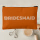 Solid brunt orange colour, small style, zippered cosmetic bag for your wedding bridesmaid that features the word, BRIDESMAID in large, modern typography on one side of bag. Perfect as a travel accessory pouch to hold makeup, perfume, and jewellery. You may personalise by adding bridesmaid name if desired to pouch. Available in many, popular bridesmaid wedding colour schemes.
