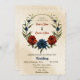 Unique wedding invitation featuring romantic burnt orange and navy blue flowers and green leaves.