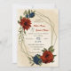 Unique wedding invitation featuring romantic burnt orange and navy blue flowers and green leaves on a beautiful geometric frame.