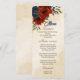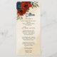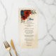 Unique wedding menu card featuring romantic burnt orange and navy blue flowers and green leaves.