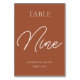 Modern table numbers elevate your wedding reception table décor. The design features an elegant script font in white on a burnt orange earth tone background perfect for a fall wedding or banquet event. Order each table number from the collection or edit this card for each number needed. The design is printed on both sides.