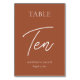 Modern table numbers elevate your wedding reception table décor. The design features an elegant script font in white on a burnt orange earth tone background perfect for a fall wedding or banquet event. Order each table number from the collection or edit this card for each number needed. The design is printed on both sides.