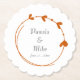 Set of 6 round, absorbent, pulp board drink coasters for wedding showers, wedding receptions, and even rehearsal dinners that feature a trendy, burnt orange colour, simple heart wreath design along with the bride and groom names and wedding date printed in dark grey, stylised lettering. Edit and replace names and date with your own.