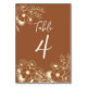 Elegant, modern boho, burnt orange, terracotta, floral table number with gold wildflower lace and handwritten script.