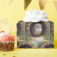 Two owls stand at the entrance of a cosy, stone archway adorned with greenery, surrounded by wildflowers