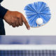 This vibrant design features a pattern of lines of different shades of blue bursting outward from a central point.