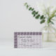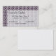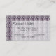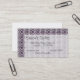 Quilt block in purple and white "spool" pattern. Eight spools rotate around a centre of dark purple. A purple flower print is the "thread" on the spool and also the framing strip between blocks. 90% white filter covers the lower right portion of card, where business details (Business Name, address, contact numbers, and name) may be personalised.