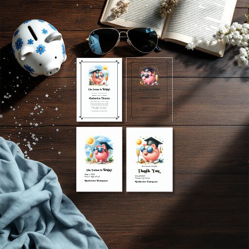 Celebrate the graduate’s bright financial future with this elegant The Future is Bright acrylic graduation invitation. Featuring a stylish piggy bank in a graduation cap with celebratory elements, this unique design is perfect for business, finance, and accounting graduates. The sleek transparent acrylic adds a modern touch, making this invitation a memorable keepsake for the special day. Ideal for those stepping into the world of business with big dreams ahead!
