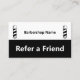 Front: This black and white referral card template has two barber poles that the name of your barbershop will be between. There's white display text on the black stripe at the bottom. The text can be edited if desired. (Shown: Refer a Friend).