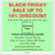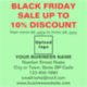 Customisable vinyl sticker with Black Friday Sale, your business name and other information. Vinyl sticker that you can use as marketing material to attract more customers. Customise it and display it to convince more customers to buy your products or clients to like your services. Design colours are dark green and red texts on light green background. Contents are Black Friday Sale, percent discount that you will offer, sale dates, your business name, logo, address, phone number, e-mail and website or your business social media page. Please check the appearance after uploading logo and typing texts. If the appearance is pleasing to you, you can place your order now. If you need to resize and move the logo and texts to fit on this sticker or on the size that you will choose, please change in the design tool. You can also change the background colour, font colour and font style in the design tool. Wishing you more sales this Black Friday.