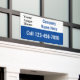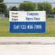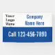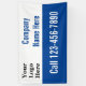 This deep blue and white banner has a display image on the top left side. You can replace the image with your logo. There's blue display text next to the image. You can edit the text to enter your company name or a custom message. The text and logo will appear on a white stripe. White display text for your phone number is on a deep blue stripe at the bottom.