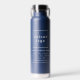 Insulated water bottle that you can customise to put your business name. You can give it as gift, giveaway item or promotional product to promote your brand name to your customers or clients. You can also include it in your marketing materials to advertise your business. Customisable water bottle that you can use to build brand name awareness. Label design on the bottle is white texts on navy blue background. To customise this water bottle, upload your business logo, type your business or company name, address, phone number, e-mail and website or social media page. After uploading logo and typing texts, please check the appearance on front and back sides. If the appearance is pleasing to you, you can place your order now. If you need to resize and move the logo and texts to fit on this bottle or on other sizes and styles that you will choose, please change in the design tool. You can also make other changes according to the appearance that you prefer in the design tool such as changing the background colour, font colour and font style.