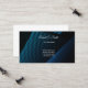 This business calling card is shown in a white basic card stock with white text on a black and blue abstract print.