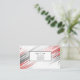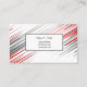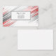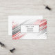 This business card is shown in a grey and red tones abstract pattern with black text.