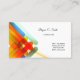 This business card is shown in a multi colour abstract pattern with black text.
