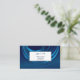 This business card is shown in the basic card stock with a modern abstract print in blue tone colours with blue text.