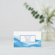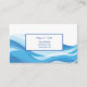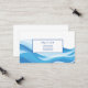 This business card is shown in a blue tones abstract wave pattern with blue text.