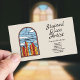 Business cards with a hand-drawn illustration of a stained-glass window with a blue sky, white clouds, and red and yellow buildings: perfect for stained glass artist, but also interior design, florist, artist designer, wedding planner, etc
