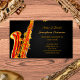 Business cards for saxophone players or instructors; black and golden music design with illustration of a saxophone; design is personalised with customisable text fields for adding your name, business, address and other informations