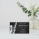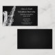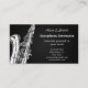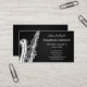 Business cards for saxophone players or instructors; black and white music design with silhouette of a saxophone; design is personalised with customisable text fields for adding your name, business, address and other informations