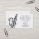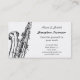 Business cards for saxophone players or instructors; white and black music design with illustration of a saxophone; design is personalised with customisable text fields for adding your name, business, address and other informations