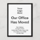 Front: A display image is at the top. You can replace the image with your logo. "Our Office Has Moved" is in the centre. Five lines of black display text for your new address are at the bottom. The front has a black border.