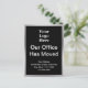 Front: A display image is at the top. You can replace the image with your logo. "Our Office Has Moved" is in the centre. Four lines of white display text for your new address are at the bottom. The front has a faux (not foil) silver border.