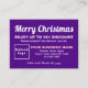 Merry Christmas! One of the most celebrated holidays of the year. It is also one of the best seasons to advertise your business or to promote your brand name to customers or clients. Attract more customers by giving them discount, one of the marketing strategies to have more customers. Customisable discount card that you can use to attract more customers to buy your products or clients to like your services. Discount card with your business brand as marketing material that you can also use to build brand name awareness. Discount card for December or Christmas in July. Design colours are pink and white texts on purple background. To customise this discount card, specify the percent discount that you will offer and the validity date. Upload also your business logo, type your business name, address and phone number. Please check the appearance on front and back sides after uploading logo and typing texts. If the appearance is pleasing to you, you can place your order now. If you need to resize and move the logo and texts to fit on this discount card, please change in the design tool. You can also change the background colour, font colour and font style in the design tool. Merry Christmas! Wishing you more sales this holiday.