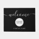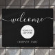 Elegant personalised business logo and name doormat featuring your company name set in a classic white text on a black background with the message "welcome" that is set in an elegant white script text. Personalise with your details and customise the colour to the colour of your choice. Designed by Thisisnotme©