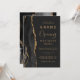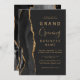 Invite customers to the grand opening of your business with this elegant modern invitation, featuring a black watercolor agate border trimmed with faux gold glitter. The customisable text combines gold coloured handwriting, copperplate and italic fonts on an off-black background. The reverse side features a matching black and gold agate design.
