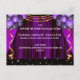 A wonderful illustration featuring a purple theatre curtain across which horizontal faux sparkling gold string lights; purple and black balloons and vertical streamers are draped. A red carpet with upright poles and red cord connecting them appears along the bottom edge and templates for your personalised wording appear above it. A single small golden bow appears in the middle to add an extra splash of glamour and faux sparkling sparklers surround it. The back has the same design with templates for additional information for your VIP guests. Ideal for any business or corporate grand opening event.