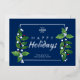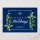 Classy modern horizontal happy holidays busines corporate both side print flat greeting card with a place for your logo featuring elegant classic watercolor christmas leaves and real silver foil pressed frame and happy holidays text on a navy blue background. Perfect Christmas Greeting Card for business companies, small business, home business, employees, holiday company or any organisation, the modern design will give your clients the impression of luxury and success. The back side has custom wording. This Happy Holidays card template is ready for your online personalisation. The silver foil can be changed to gold or rose gold.