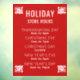 Inform your customers at front door view of the upcoming holiday season with this Business Holiday Store Hours Red Decorative Custom Window Cling.  Available in different sizes and colours.  This simple modern design has the customisable red background and easy to read white print lettering and numbers for your open and close store hours and days.   The top area of sign has "Holiday store hours" designed in white bold letters.  Decorative holly berry leaves are on each corner.  CLICK PERSONALIZE TEMPLATE OPTION AND FOLLOW THE PROMPTS