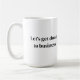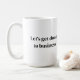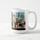 This ceramic coffee mug is shown with a cute kitten in a business setting print with text that say, "Let's get down to business".