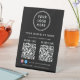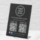 Professional all-purpose black table top pedestal sign for your business. Upload your logo and 2 QR codes for customers to scan for payment, information, a list of your products, services, prices, etc. Label the QR codes and add your business name, phone number, street address, website or other information in simple white typography. Also add your facebook and instagram user id for customers to follow you online.