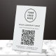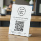 Modern table top pedestal sign for your business. Easily create a QR code linked to your website for customers to scan for a list of your products, services and prices. Add your logo, business name, phone number and street address in simple typography.