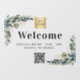 A transparent background and black text. Decorated with eucalyptus corners. Personalise and add your logo and text. Add your web url to your website (or social media account) to the QR code.